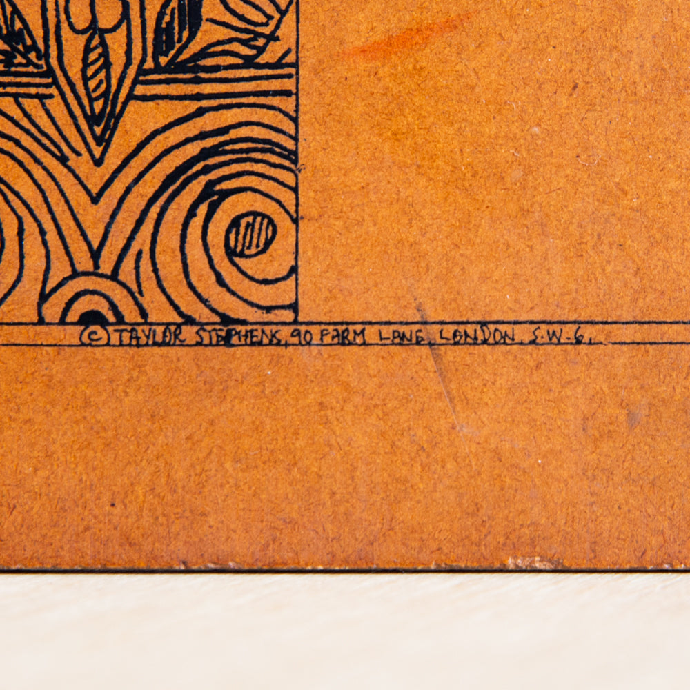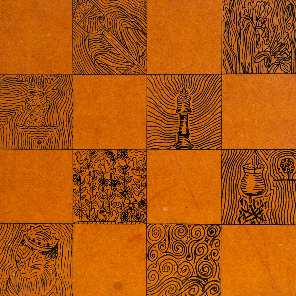 The pieces make up a particularly fine full set in exceptional condition, all crafted from good quality boxwood and bursting with character, especially those knights. The possibly unique playing surface has been mapped by hand and beautifully illustrated with great attention to detail, each 'black' square featuring everything from fantastical scenes and expressive characters to flowers and animals. Hand signed by Taylor Stevens of 90 Farm Lane SW6, which is just a stones throw away from Stamford Bridge, London.