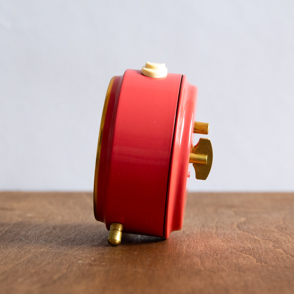 A joyous little alarm clock and a serious 'time-capsule' at that - all original packaging almost perfectly preserved featuring bold blazing red, white and black graphics that were typical of post-war optimism and modernist ideology. Nestled inside sits the equally striking timepiece, a bright coral Eureka Reptit produced in France, 1950s.