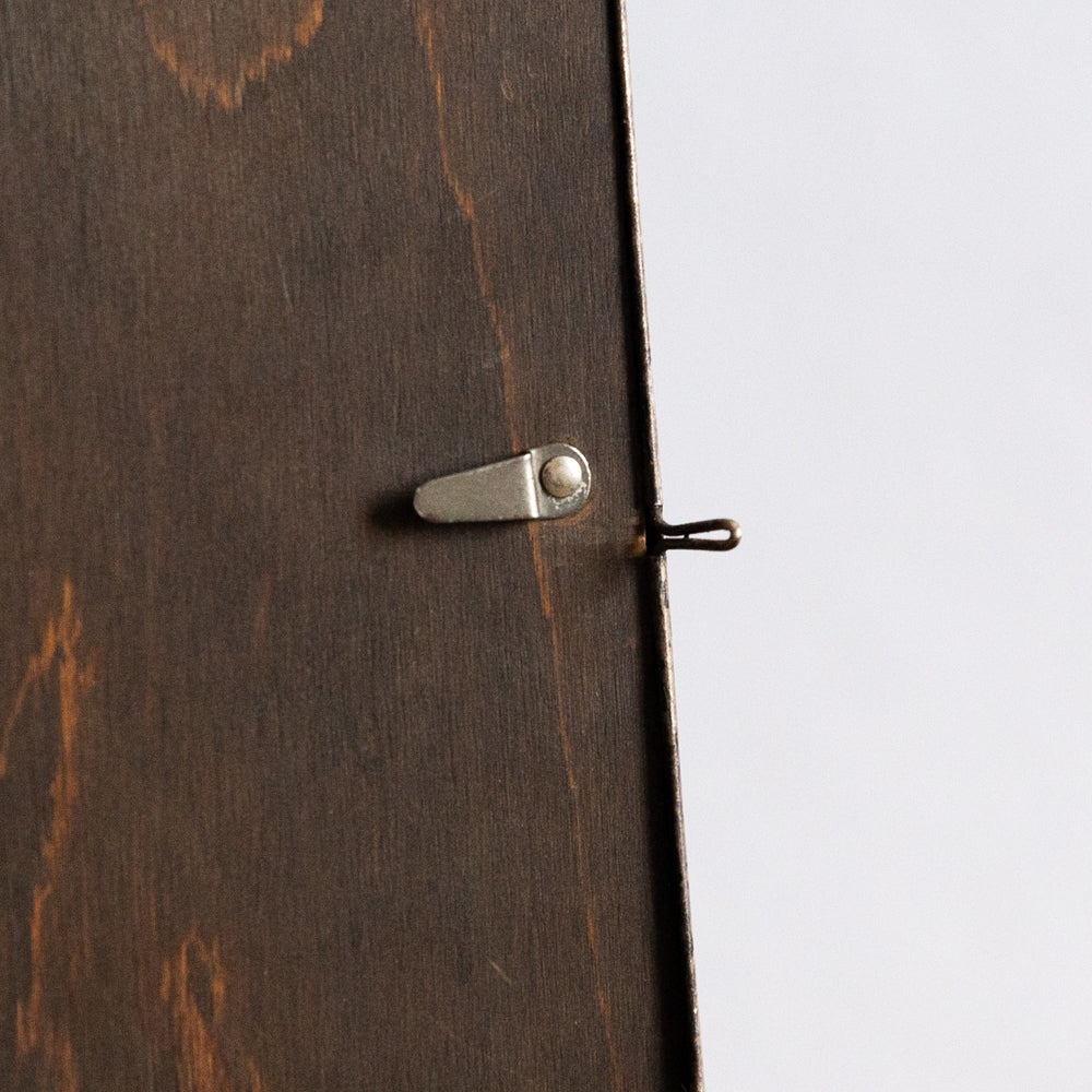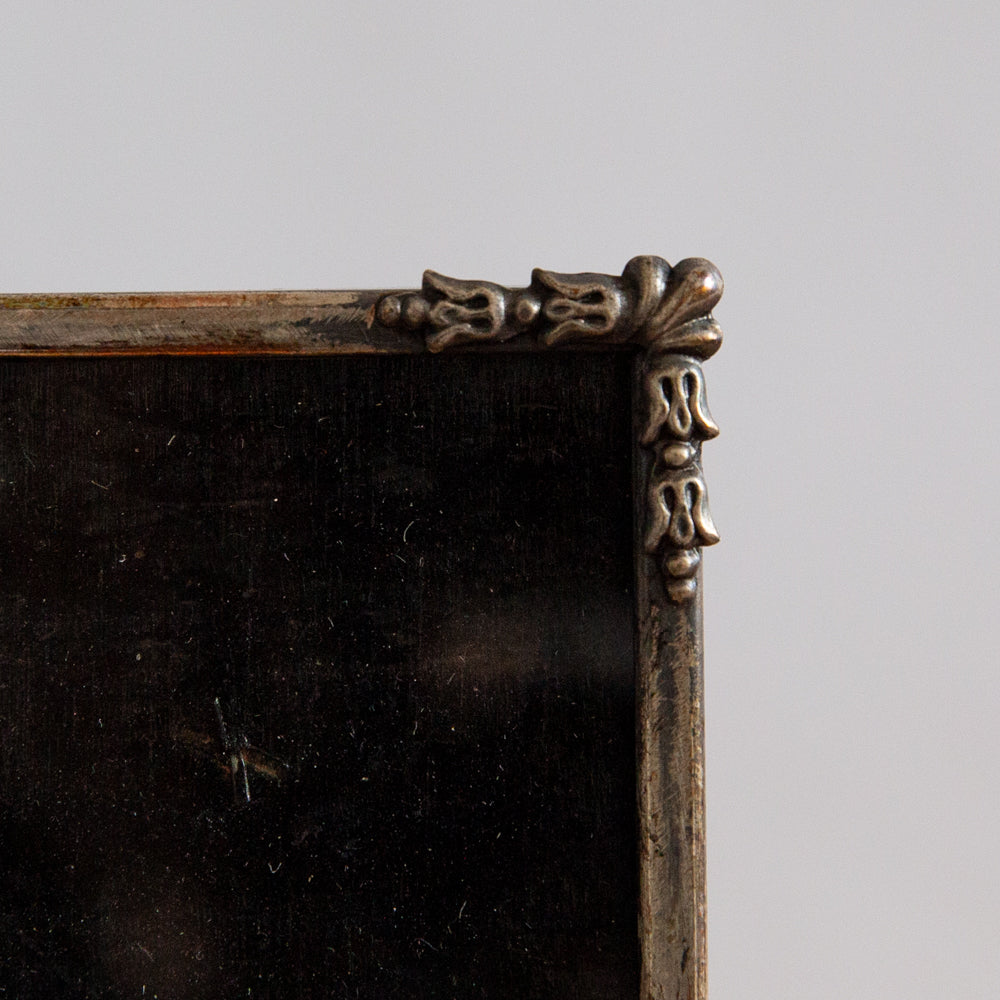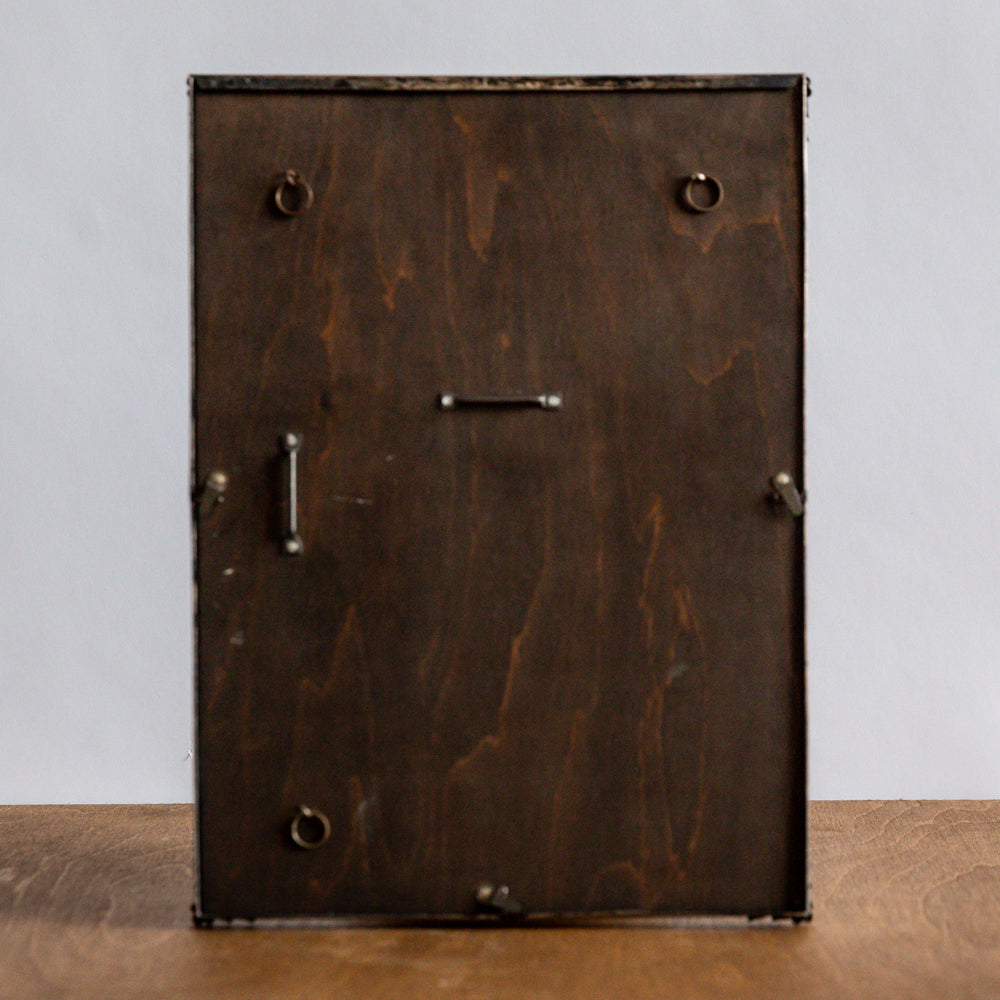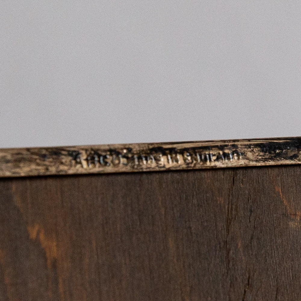 This well-worn mid-20th century plated brass picture frame by Arco, England, has been in my possession for years. It was just waiting for the right piece of art to fill the space, and what is essentially a perimeter produced by dark and heavy staining applied to the backboard.