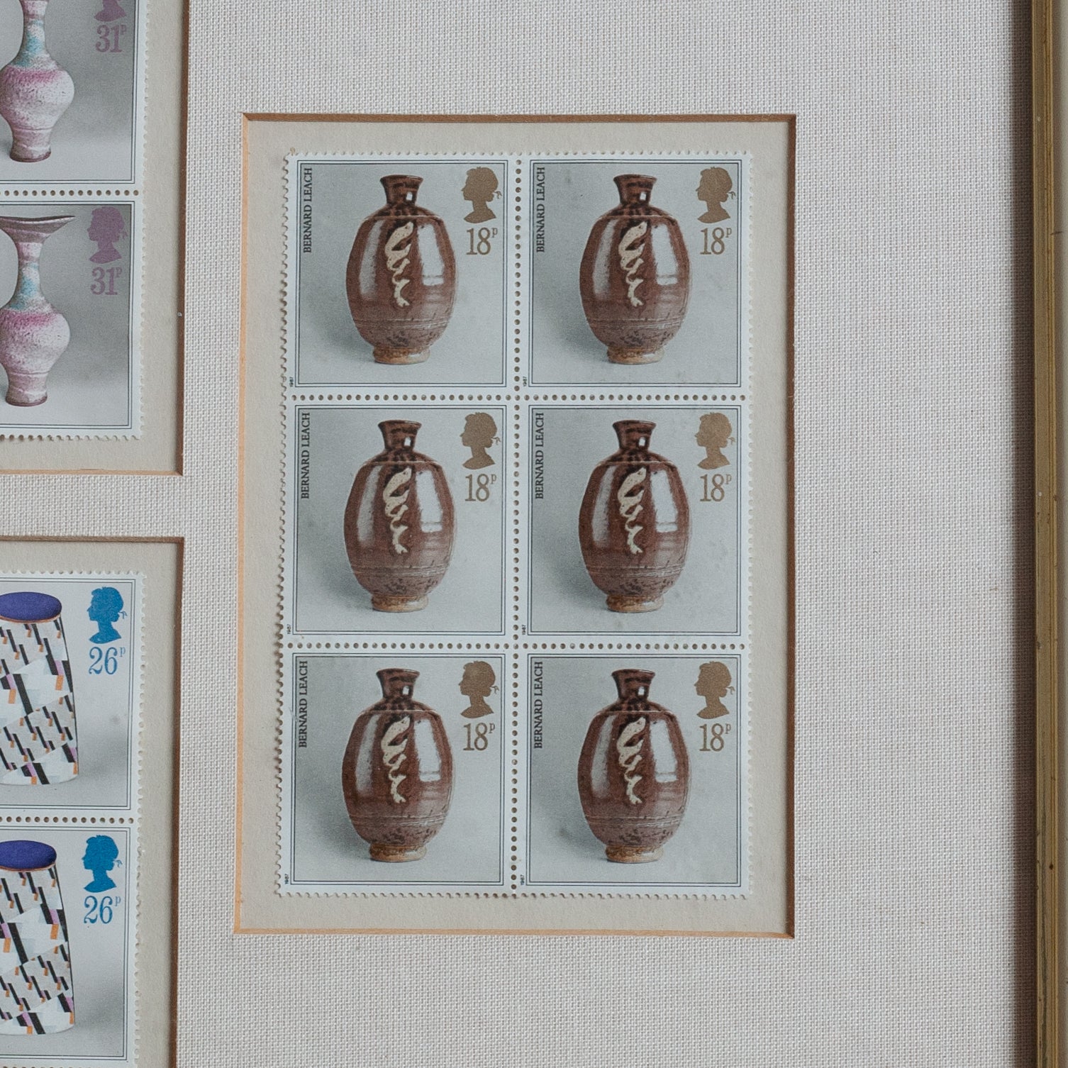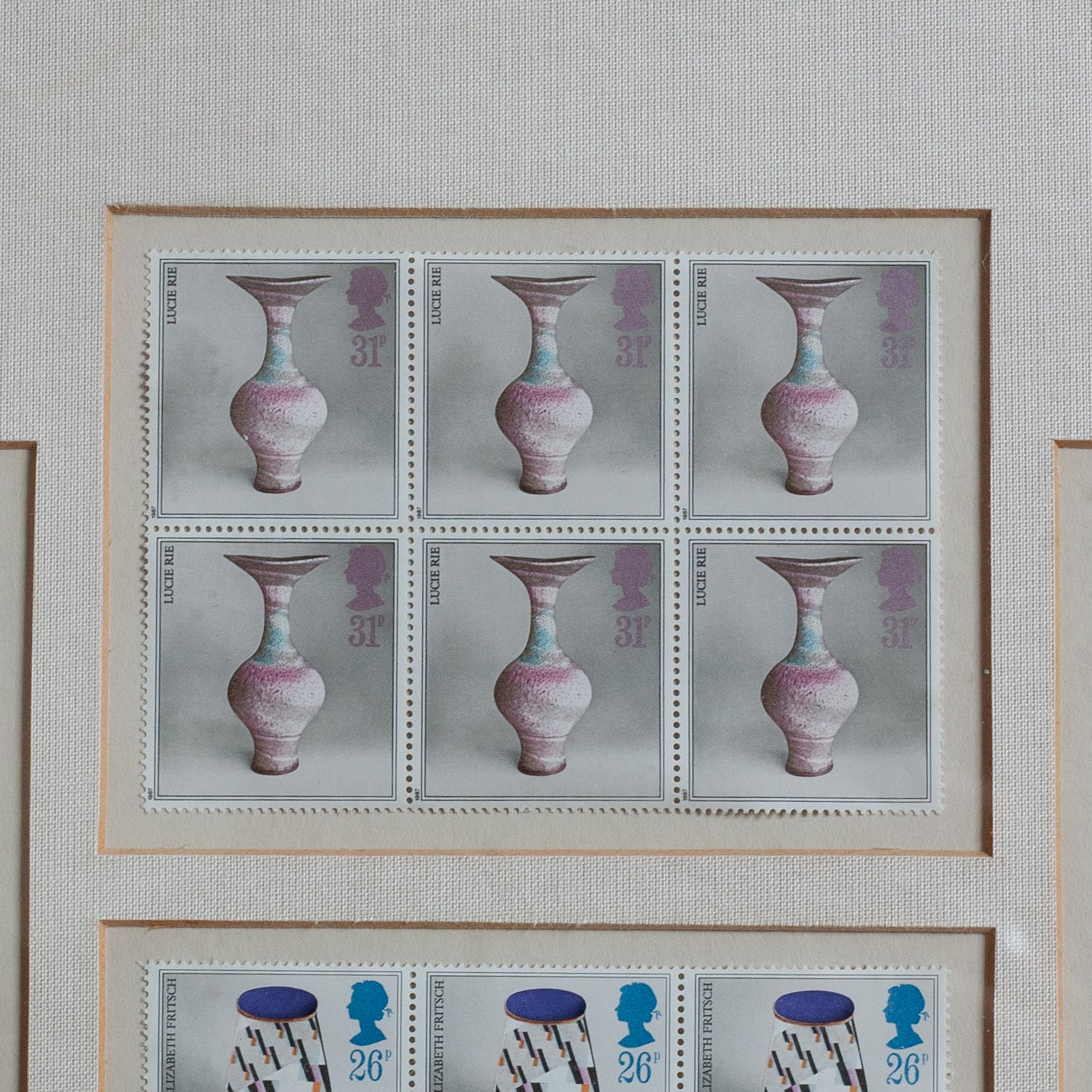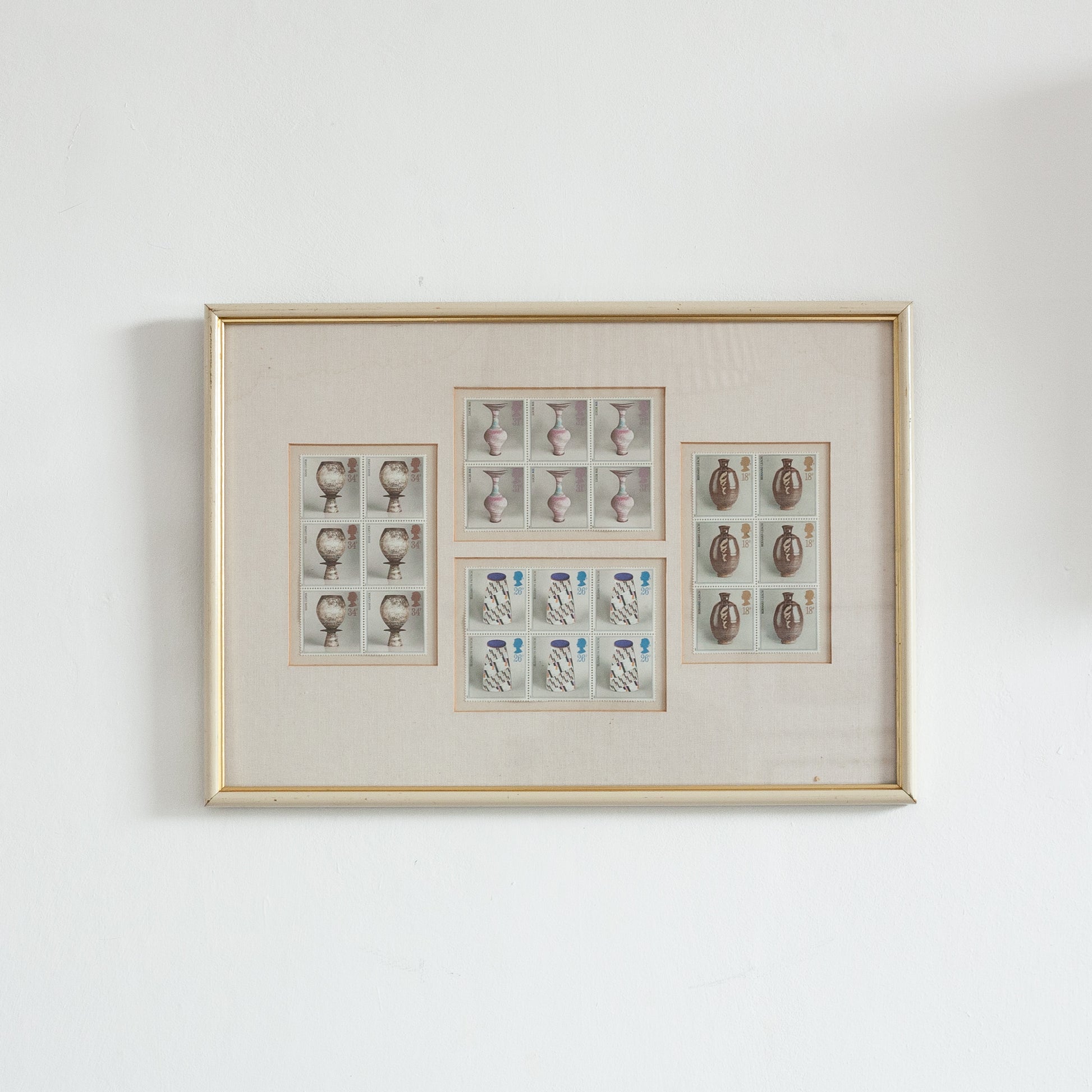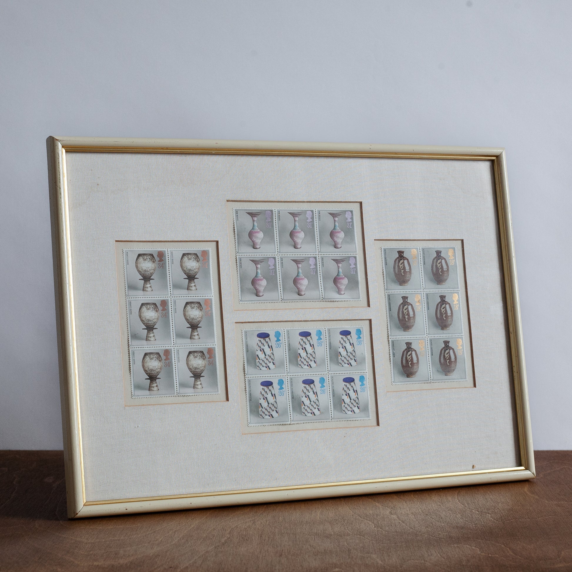 This framed piece displays a group of now iconic Royal Mail studio pottery postage stamps including a total of four original blocks of six. All lightly mounted under glass with borders. These stamps feature beautiful pots by Hans Coper, Lucie Rie, Bernard Leach and Elizabeth Fritsch. Issued on the 13th of October 1987, they were a commissioned work by outstanding post-war photographer Tony Evans, who worked with equal success in both editorial and advertising fields.