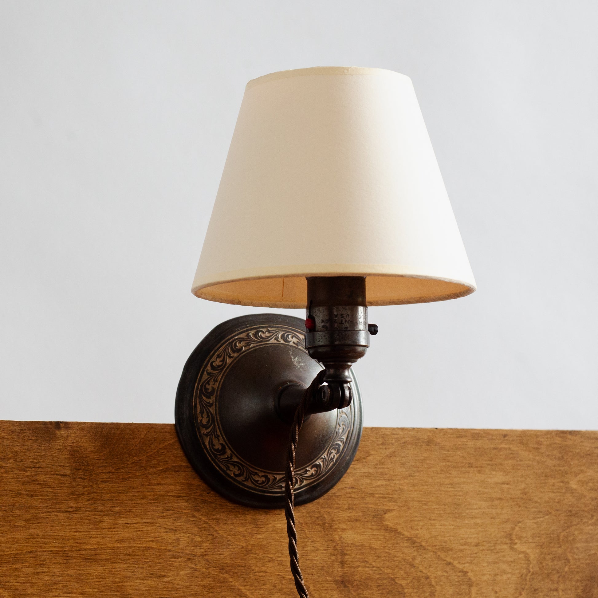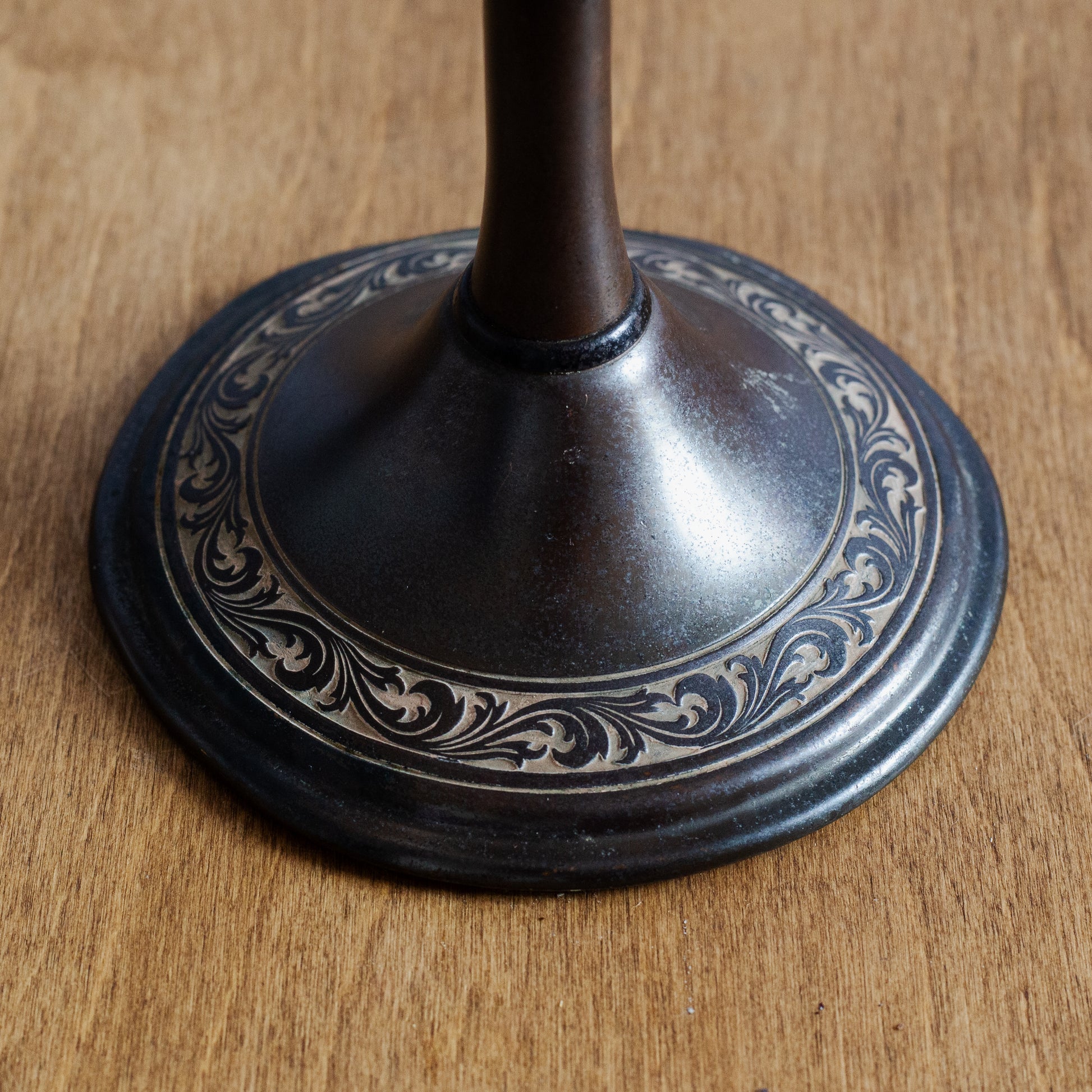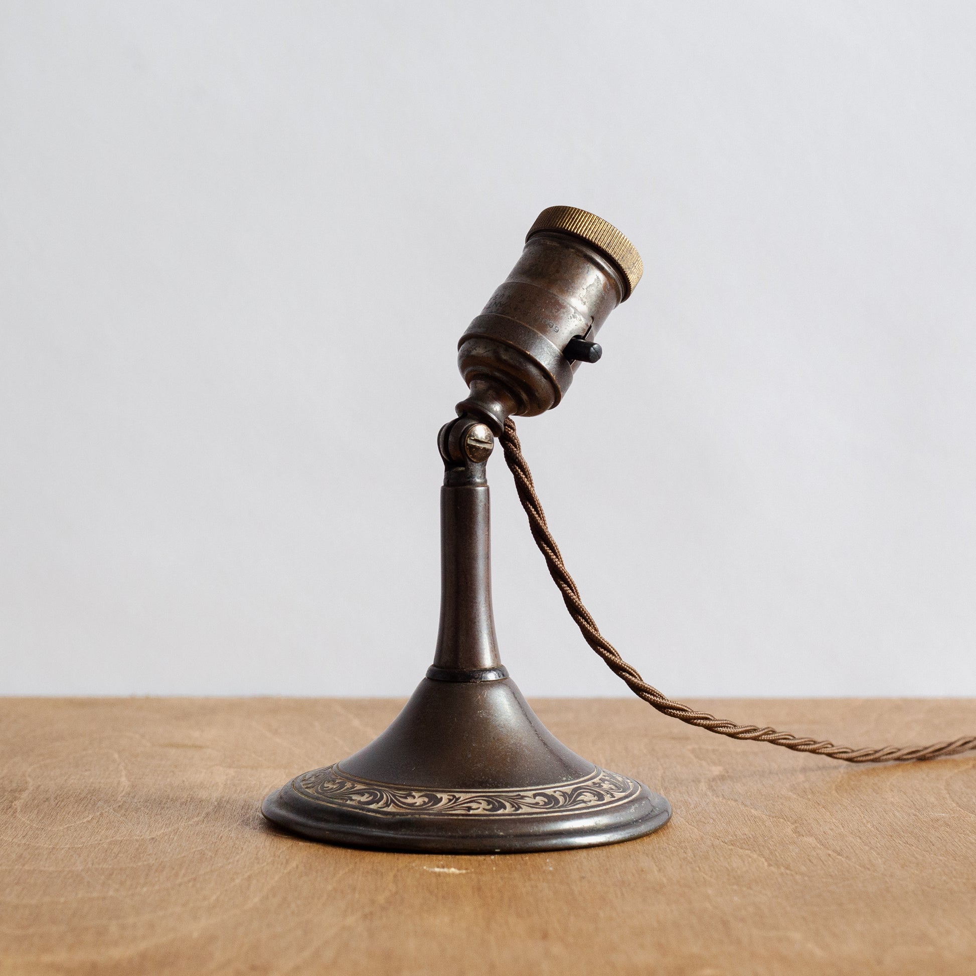 Beautiful and dark patina consistent across the lamp with intricate contrast leaf scroll decoration to the base. All parts are original, including the bulb holder - a bayonet fitting which stopped being used in the US a long time ago.