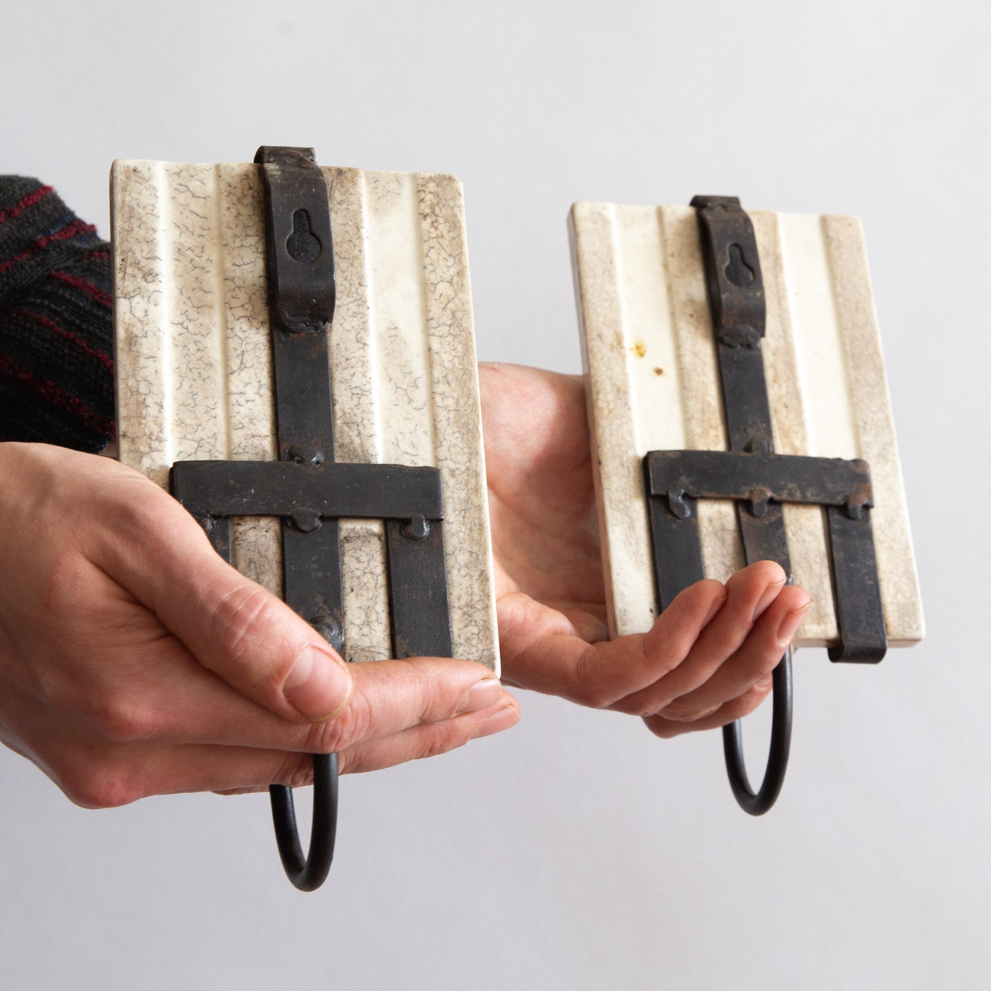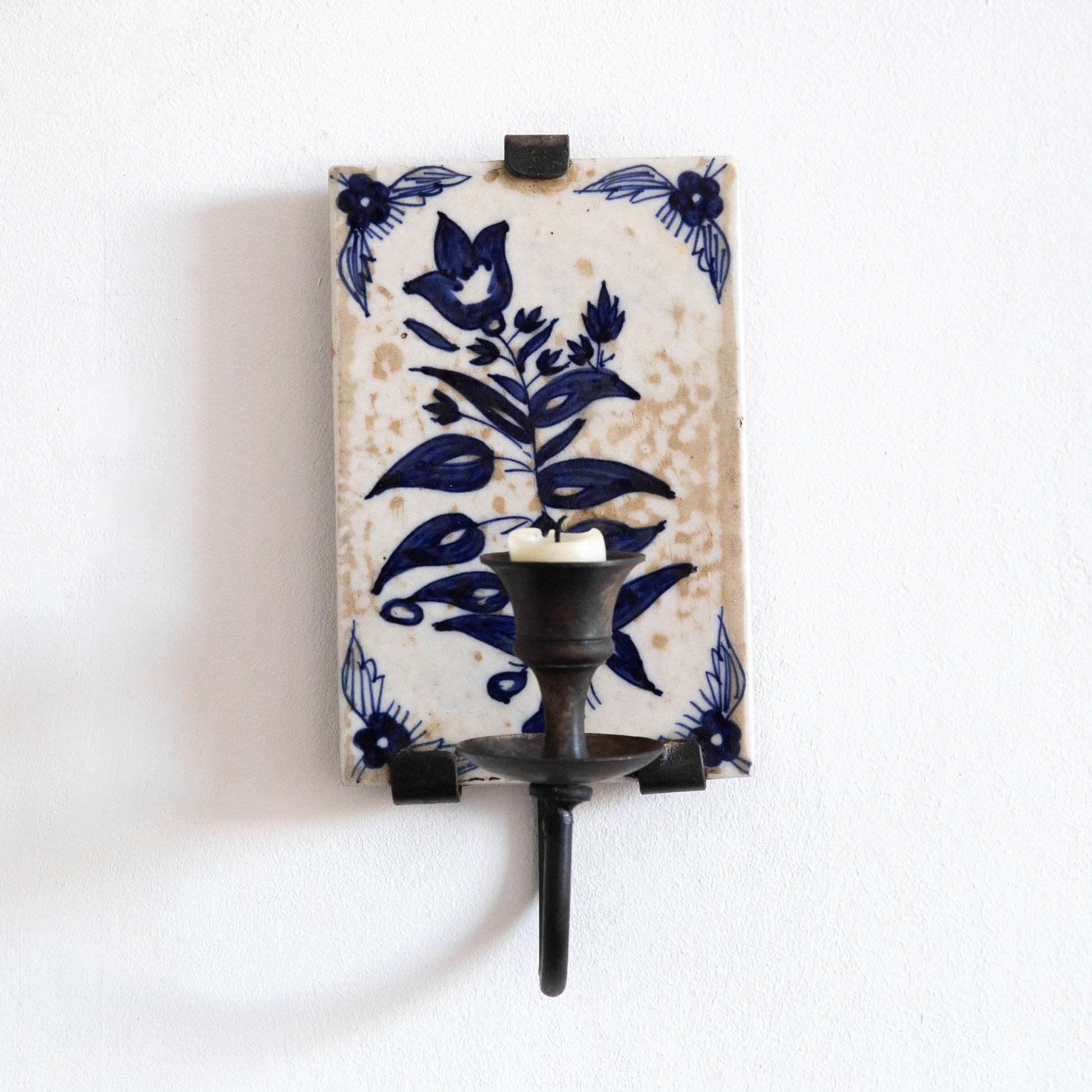 A lovely and rare pair of Portuguese blue and white glazed tiles with hand painted floral decoration on a cream base. Both are held securely in place with hand built blackened steel mounting brackets featuring hook mounts to the reverse, where each slender candle arm emerges to hold aloft an equally elegant drip tray and candle holder.