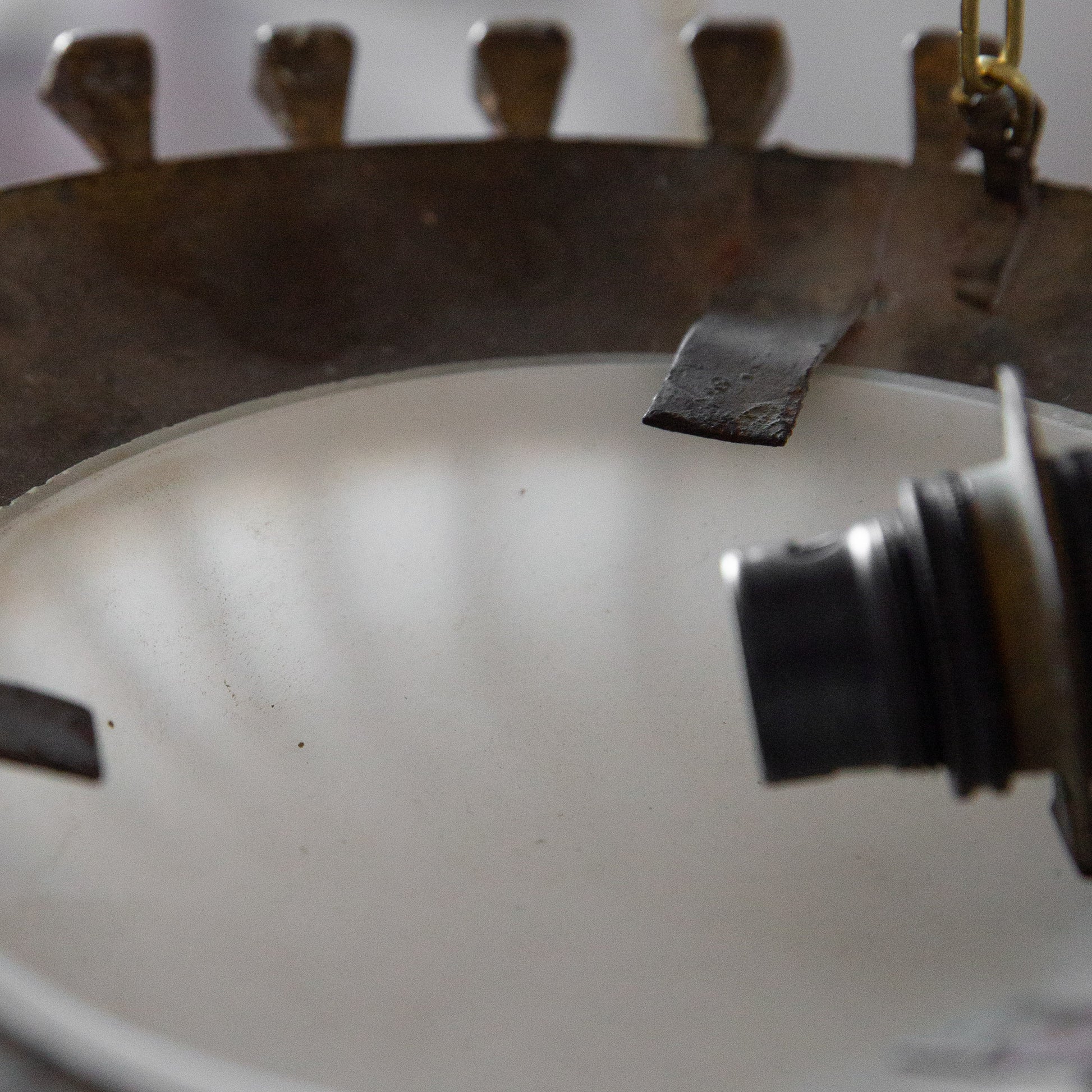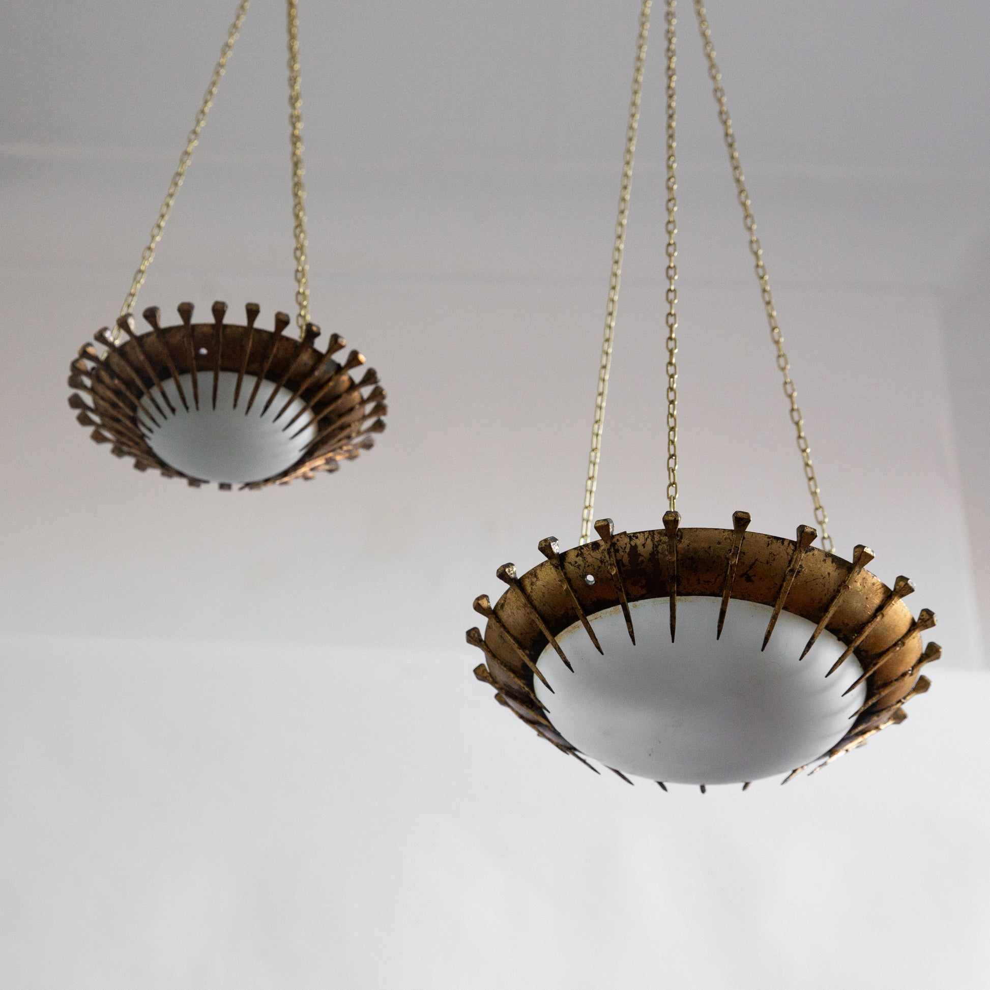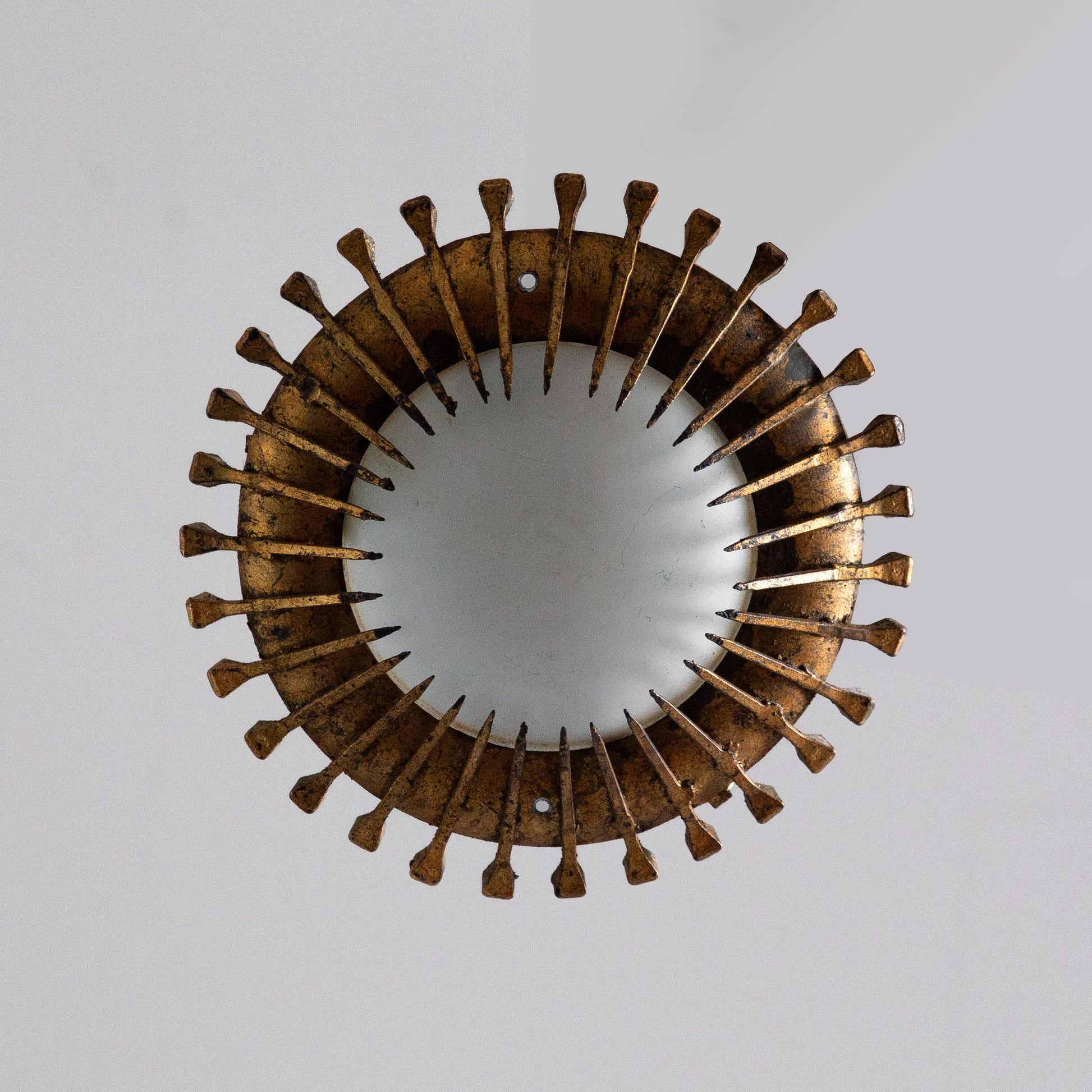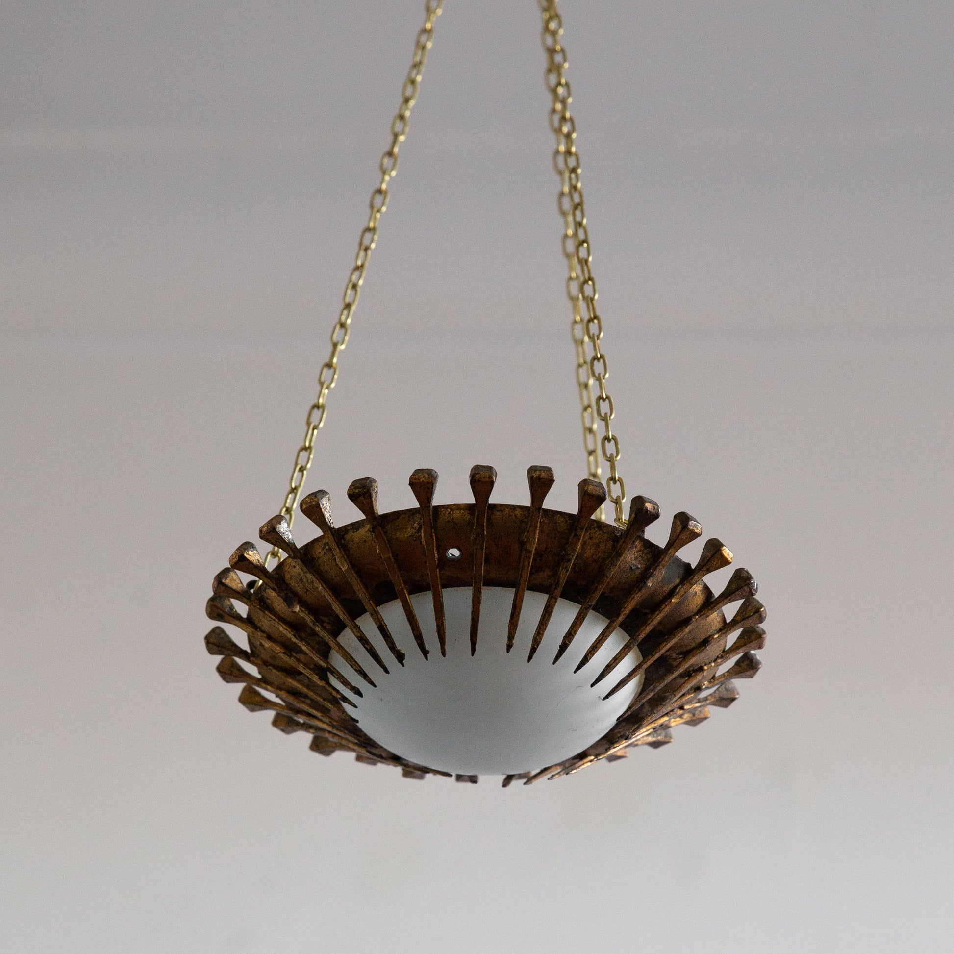 One of two unusually small brutalist hanging plafonnier lamps new to the SAD Gallery collection, this one being the smallest. Featuring a striking array of water gilded spikes or nails in sunburst formation following the dish perimeter.