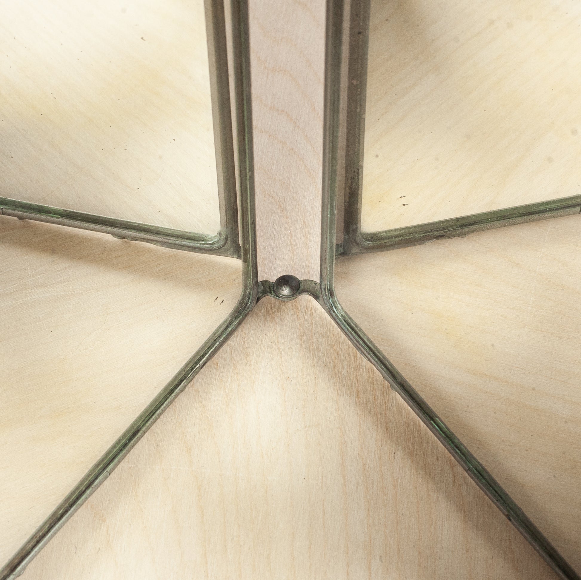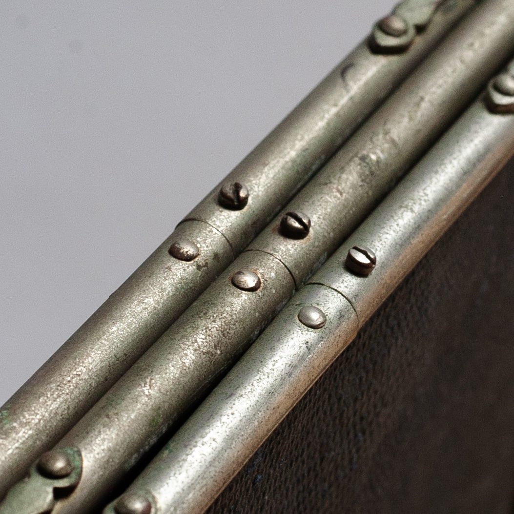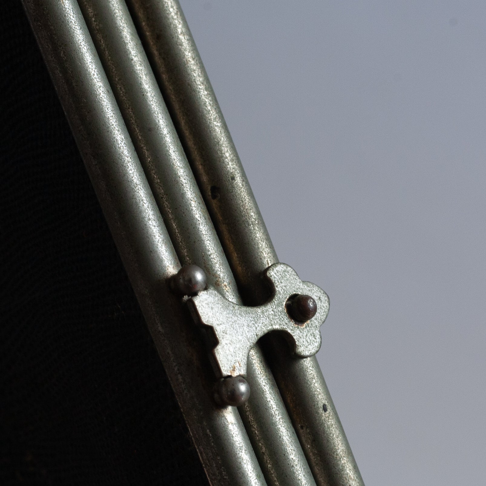 A very smart 1950s French barbers mirror with three nicely aged panels held within a hand-assembled metal frame, mounted in place with tiny rivets and screws. The hinges and latch allow for the hanging or standing piece to become a compact foldable travel companion.