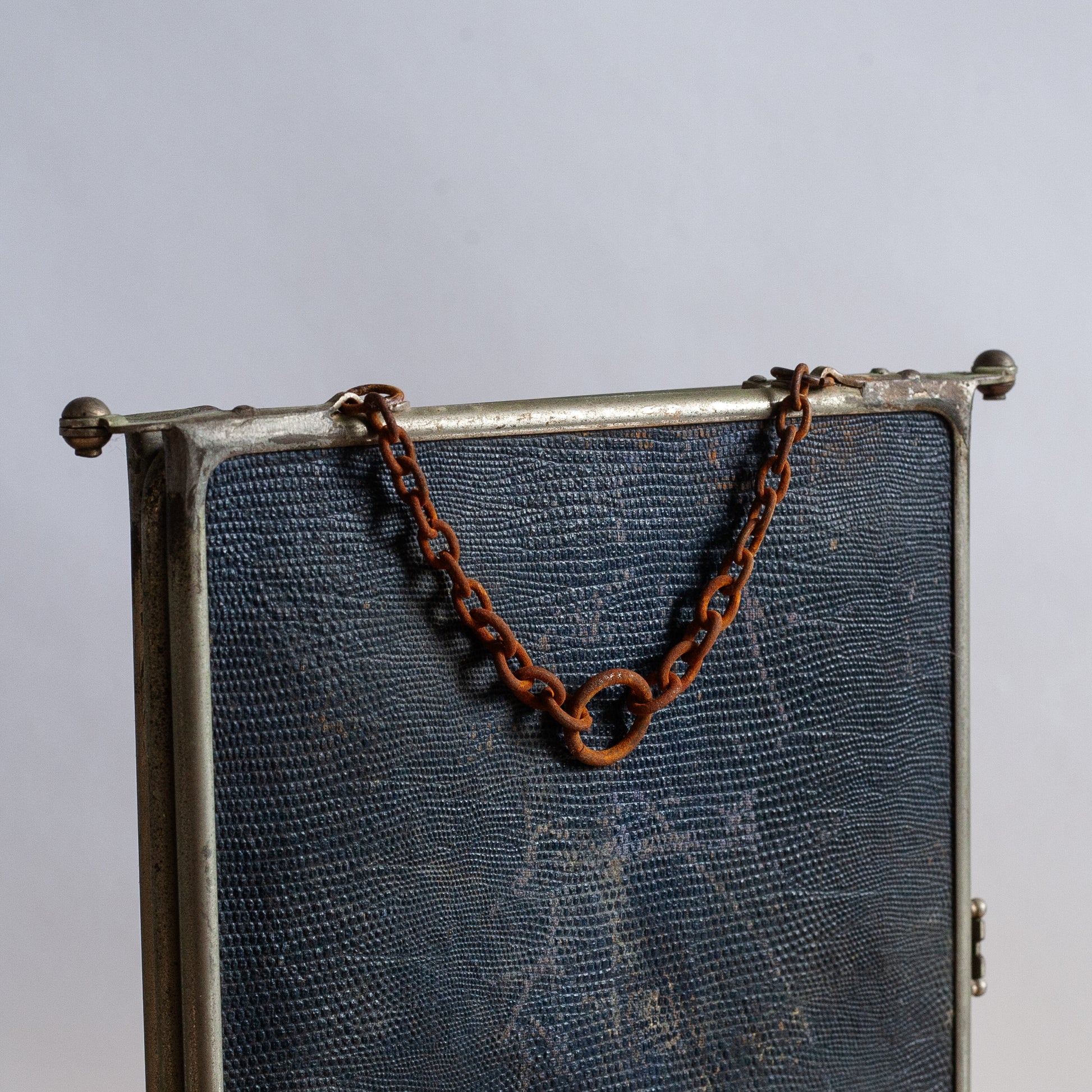 Gorgeous patina throughout, the faux reptile leather being well-worn yet retaining a deep dark blue colour contrasted against the rusted orange hanging chain.