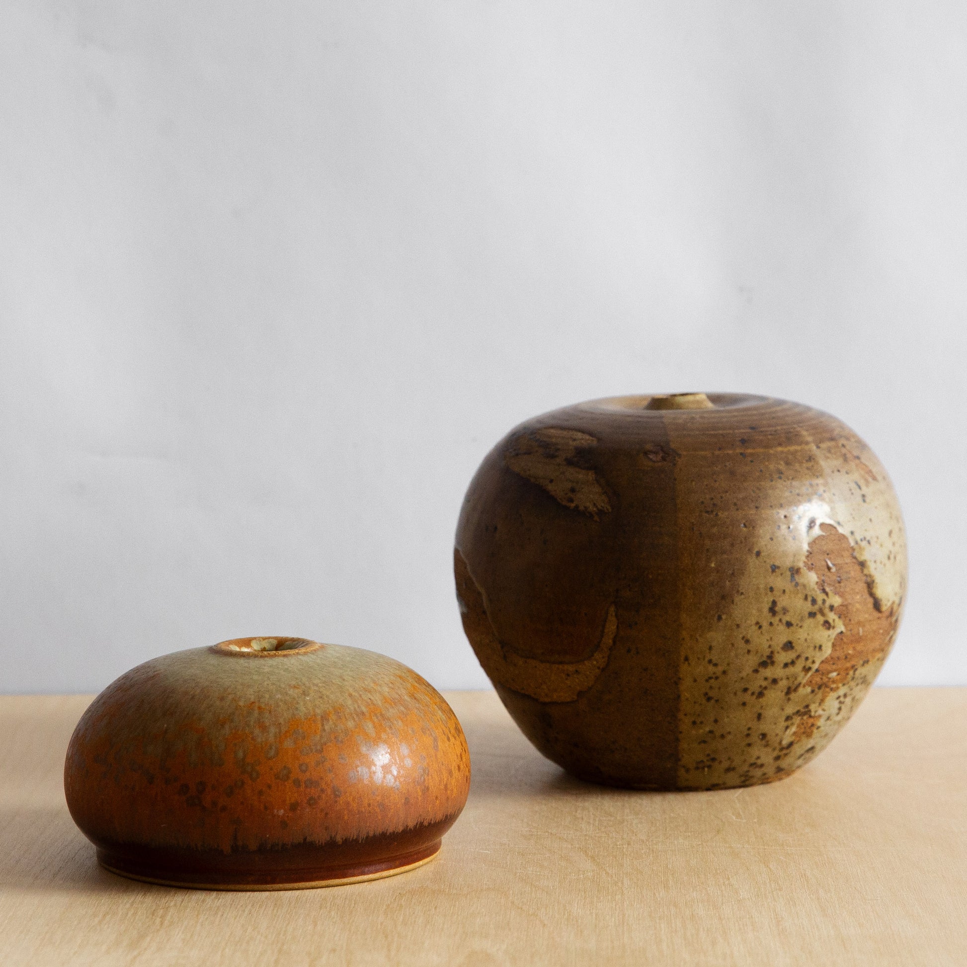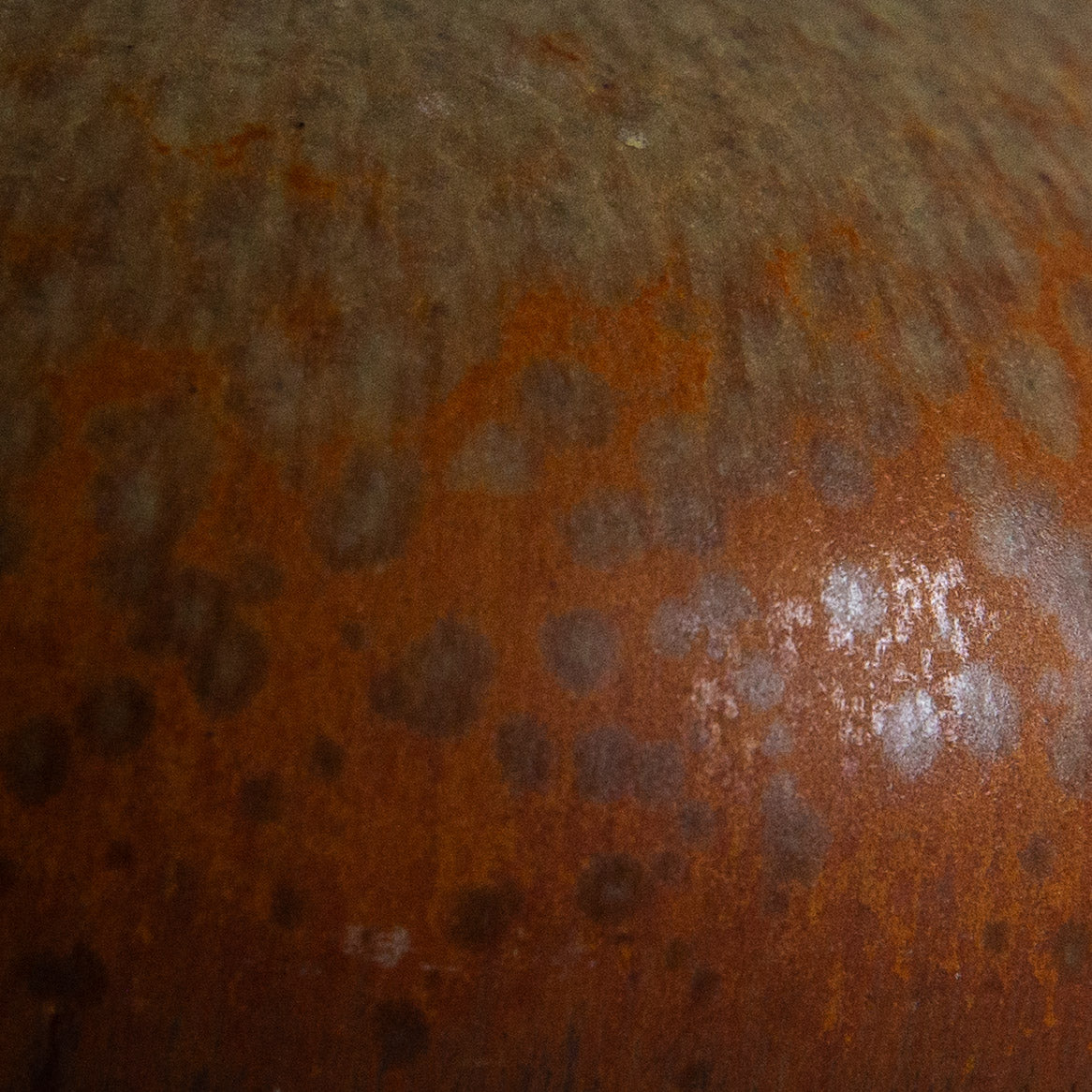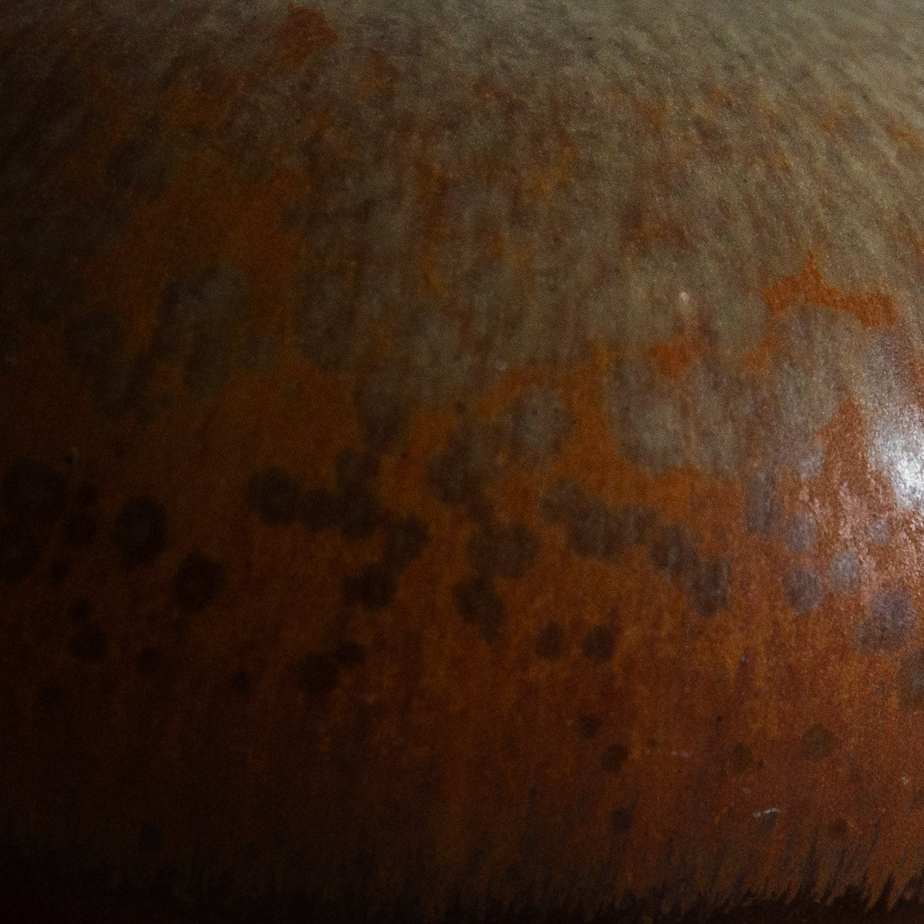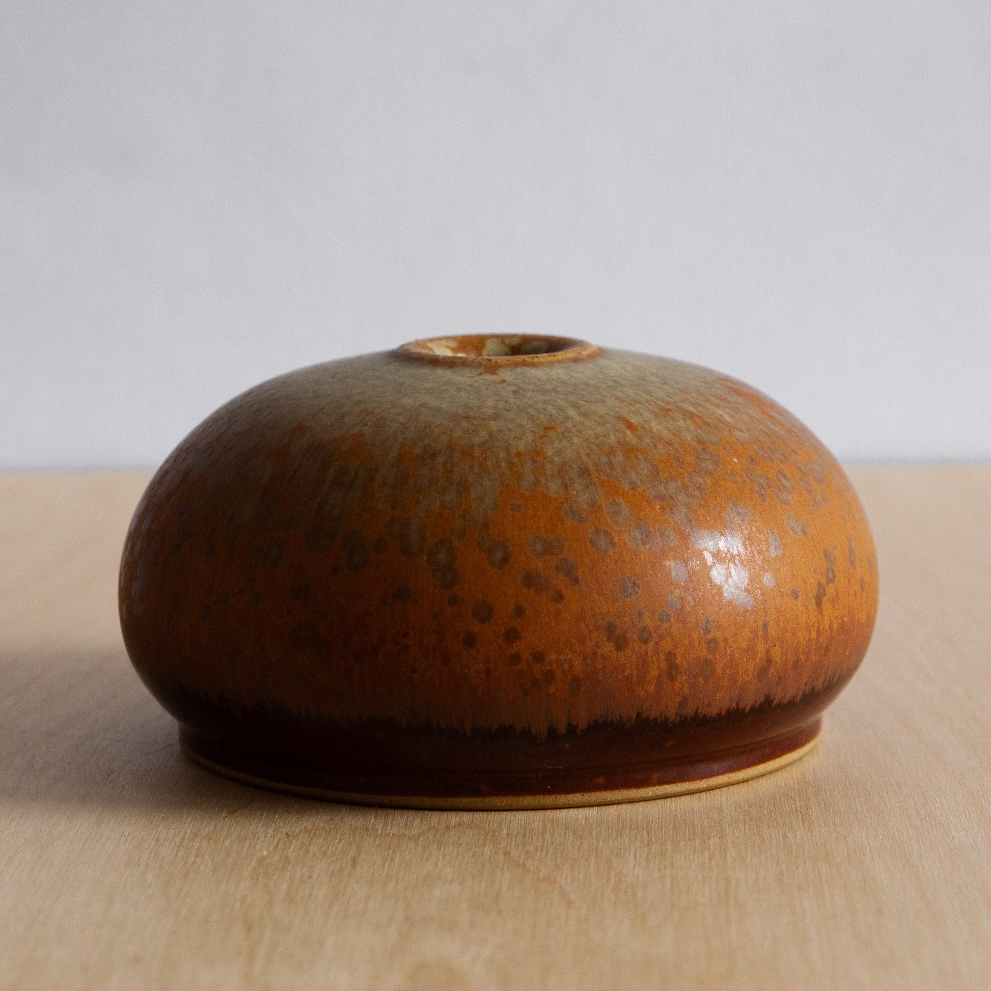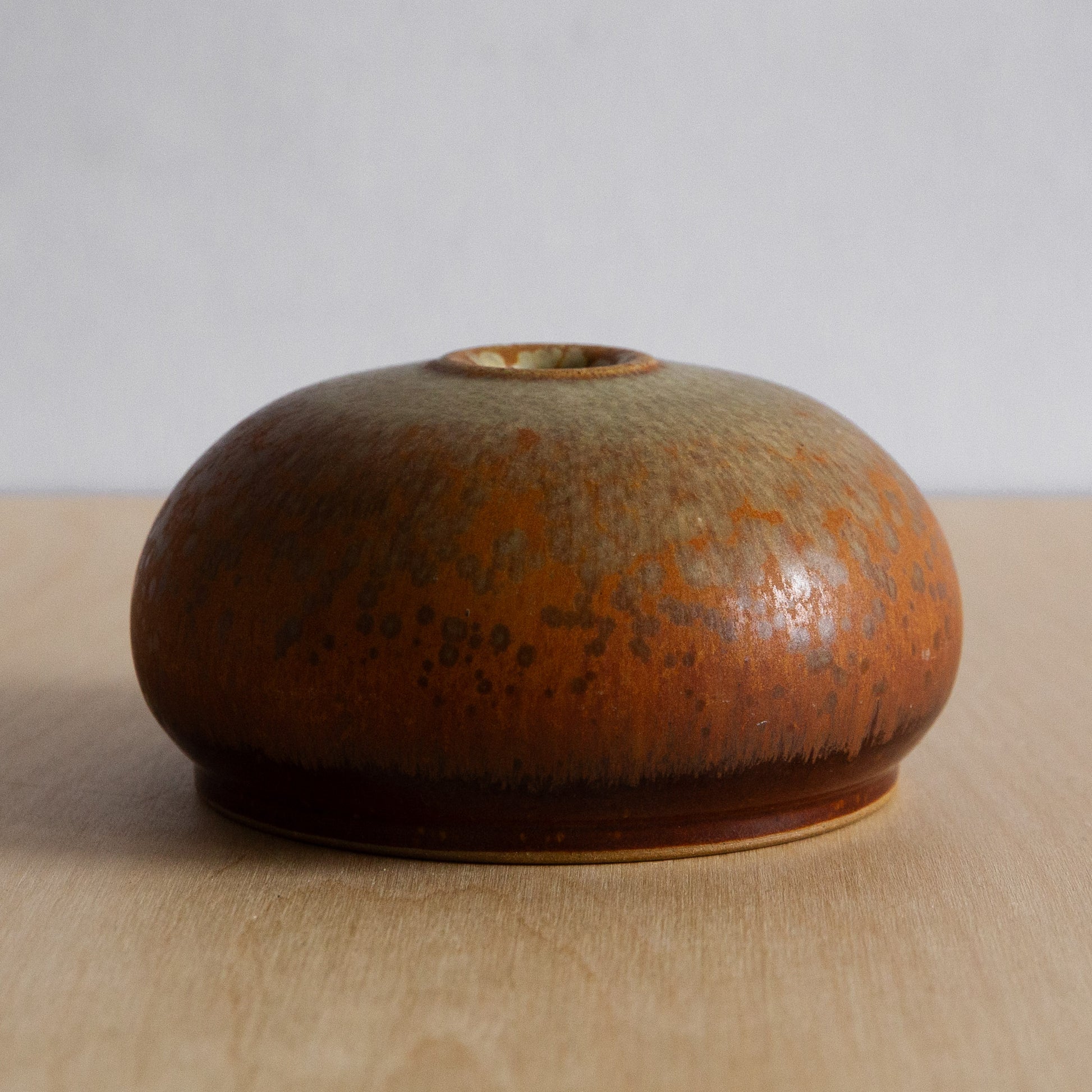 A gorgeous stoneware vase produced in Rothenburg, Germany, featuring a beautifully speckled fur glaze in tones of orange, green and dark burgundy resembling a striking iris. A unique, squat shape which showcases tremendous throwing skill, resulting in one small slightly lipped opening for floral arrangements. In some ways I find it to be quite reminiscent of stoneware that came from Scandinavia in the 20th century.